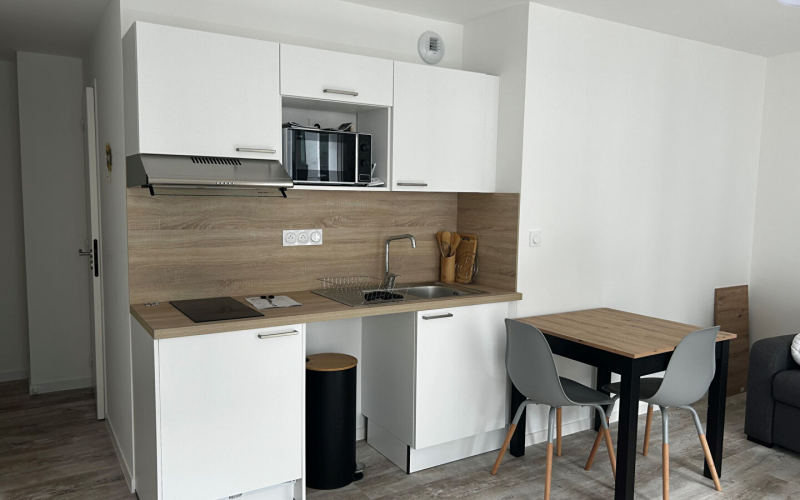 Se trouvant au premier étage, il comprend un entrée avec placard, un séjour avec cuisine ouverte aménagée et équipée dans son intégralité (four, plaque de cuisson, hotte, micro-onde, réfrigérateur, lave vaisselle). Un dégagement qui dessert 2 chambres (dont l'une avec placard aménagée) donnant sur une petite loggia. Salle d'eau et WC séparé.
